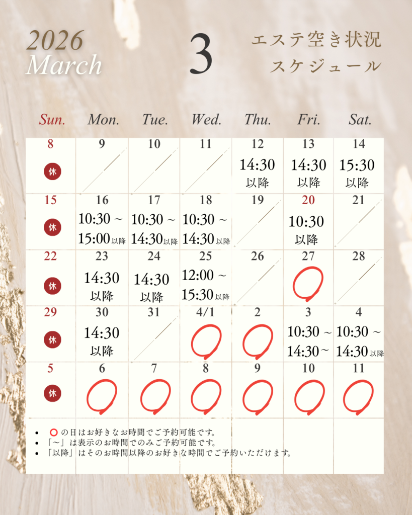 3月のエステ空き状況スケジュール(御殿場店)2026/3/11